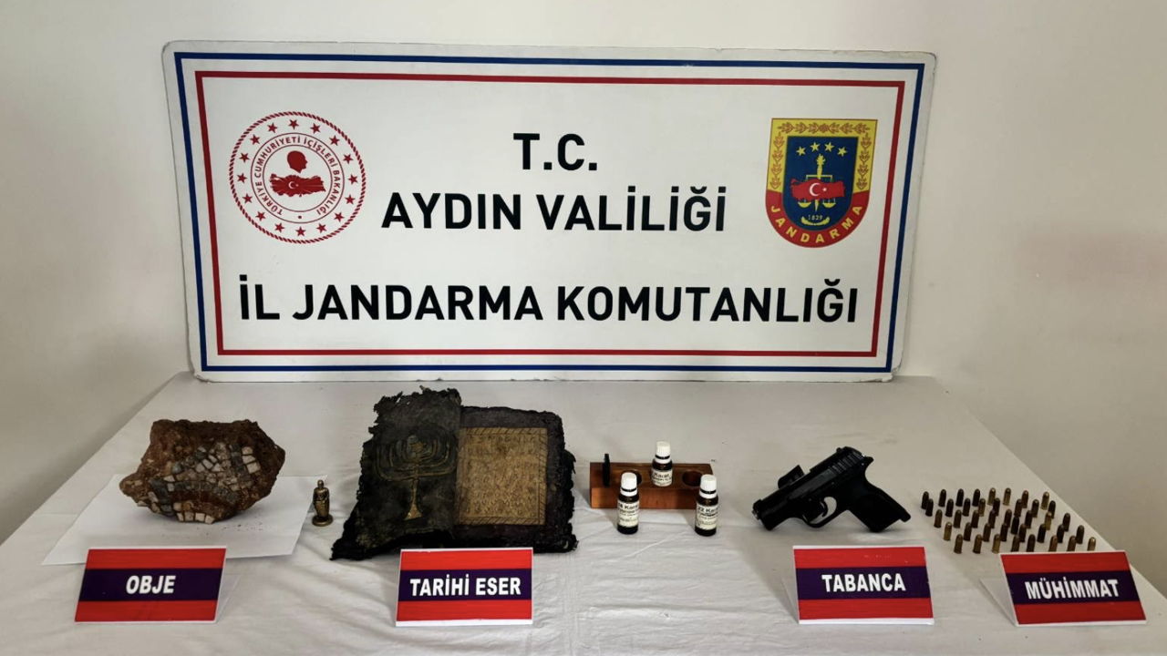 Efeler ilçesi Güzelhisar Mahallesi’nde ikamet eden M.E. (50) isimli şüphelinin evinde yapılan aramada; Ortodoks/Bizans dönemine ait 16 sayfalık deri üzerine altın işlemeli dua (tılsım) kitabı, Neolitik döneme ait mozaik taşı ve Roma/Bizans dönemine ait minyatür heykel ele geçirildi. Aramada ayrıca ruhsatsız, seri numarası bulunmayan bir tabanca, şarjör, 41 adet 7x65 çapında fişek ile altın ve gümüş saflık ölçümünde kullanılan solüsyon ve mihenk taşı da bulundu.