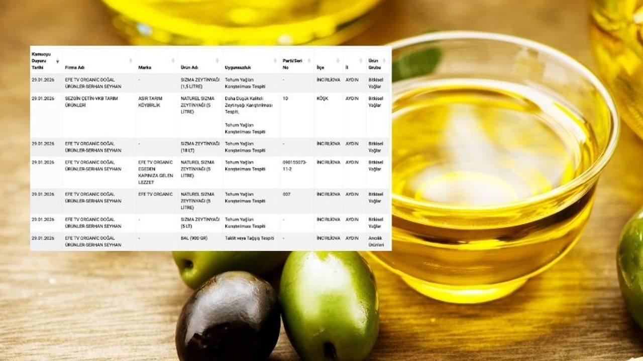 Bakanlığın denetimlerde bulduğu bilgileri, 5996 Sayılı Veteriner Hizmetleri, Bitki Sağlığı, Gıda ve Yem Kanunu’nun 31’inci maddesinin 6’ncı fıkrası uyarınca kamuoyunun bilgisine sunabileceği hükme bağlanmıştı. Buna göre bakanlığın 29 Ocak 2026’da duyurduğu ‘Taklit veya Tağşiş Yapılan Gıdalar’ listesine göre zeytinyağı ürünlerinde ‘Tohum Yağları Karıştırılması Tespiti’ nedeniyle uygunsuz bulunan markalar ve ürünler arasında Efe TV Organic Doğal Ürünler ve Asır Tarım Köybirlik firmaları yer aldı.