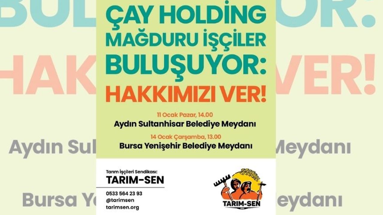 Çay Holding mağduru işçiler, 11 Ocak Pazar günü Aydın Sultanhisar’da, 14 Ocak Çarşamba günü ise Bursa Yenişehir’de düzenlenecekleri buluşmalarda yaşadıkları süreci basın ve kamuoyuna aktaracak.