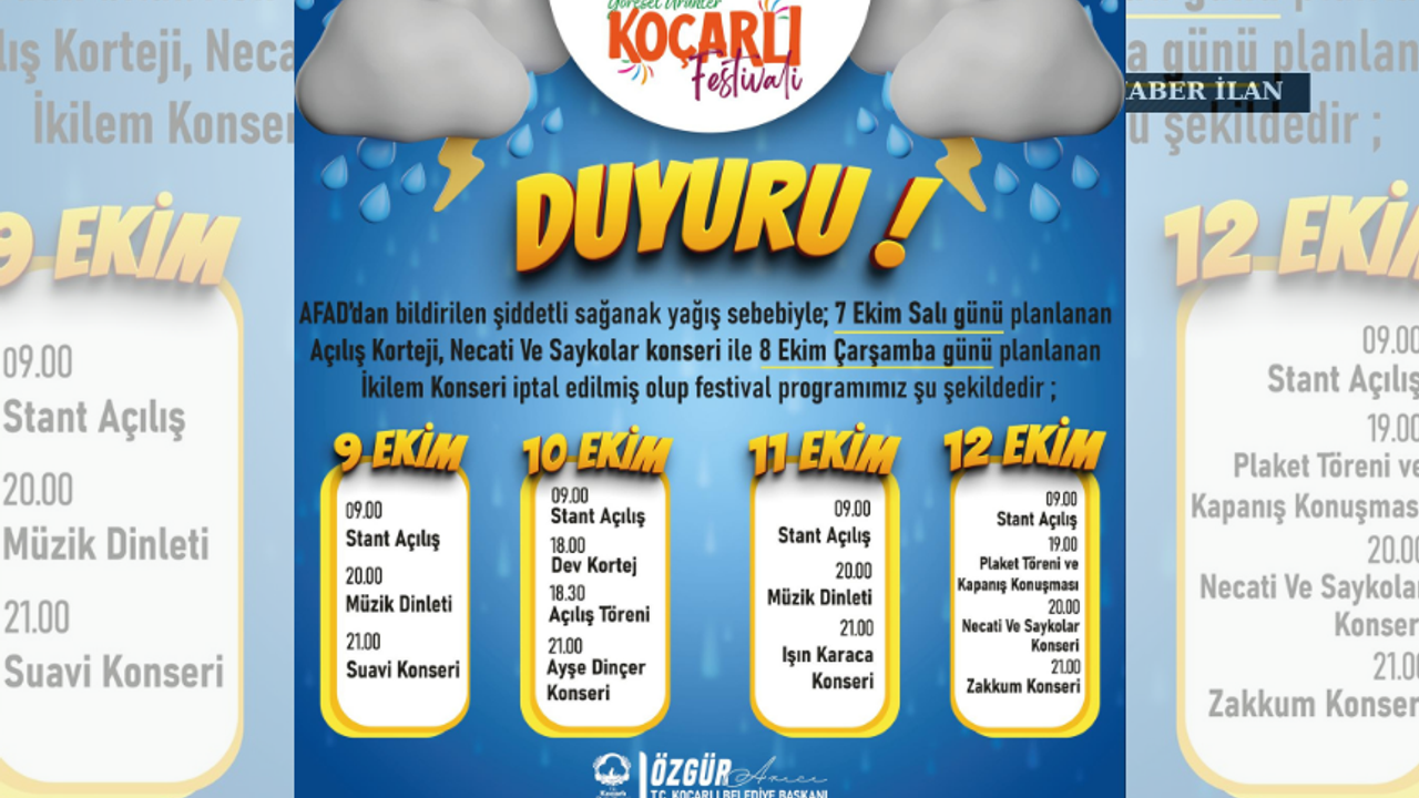 Belediye tarafından yapılan açıklamada, 7 Ekim Salı ve 8 Ekim Çarşamba günleri yapılması planlanan etkinliklerin iptal edildiği, festivalin 9 Ekim Perşembe günü itibariyle yeni programla devam edeceği duyuruldu.